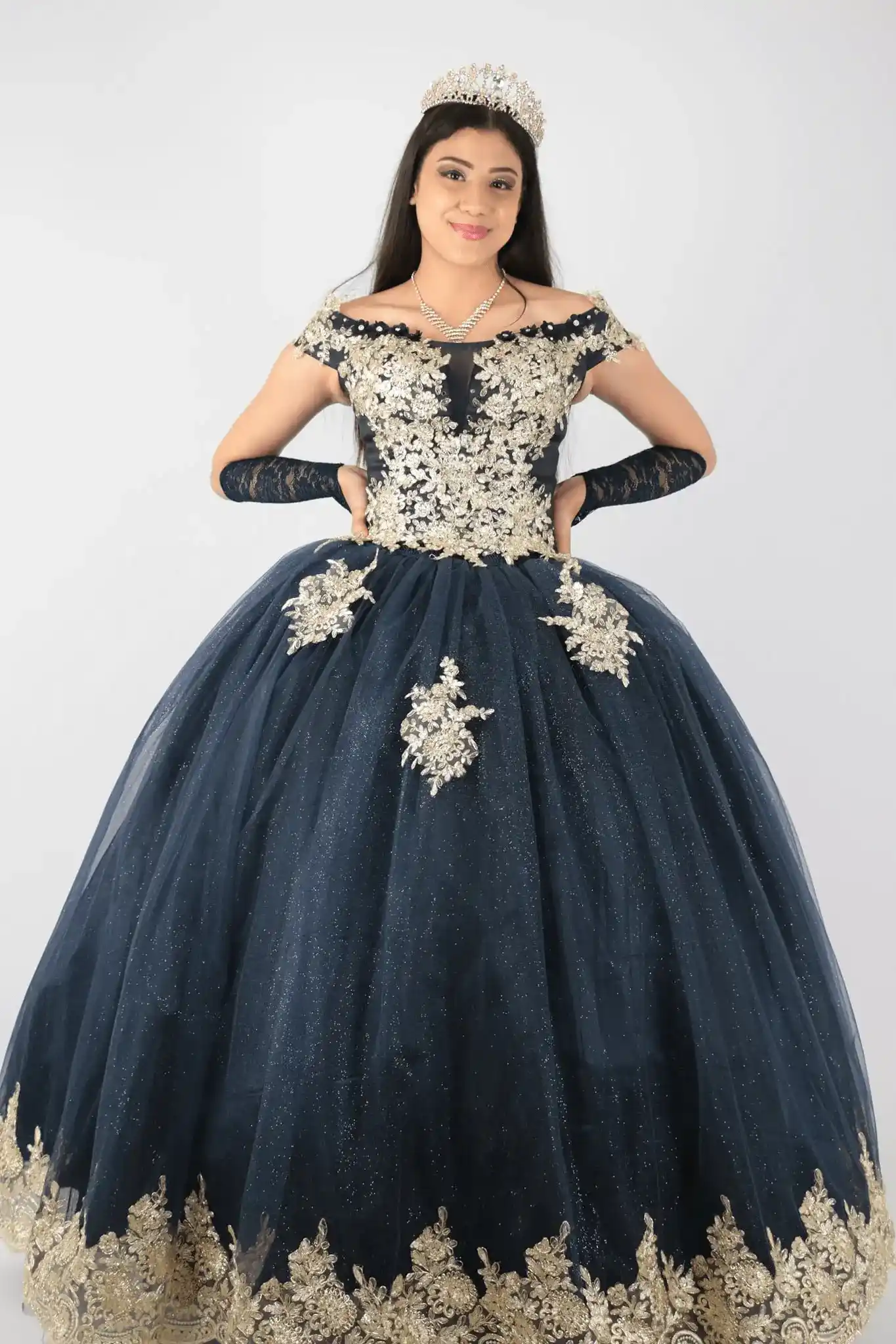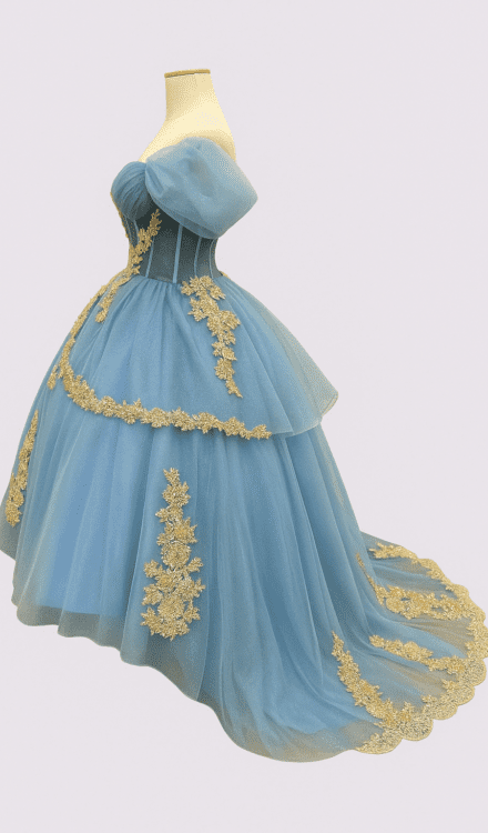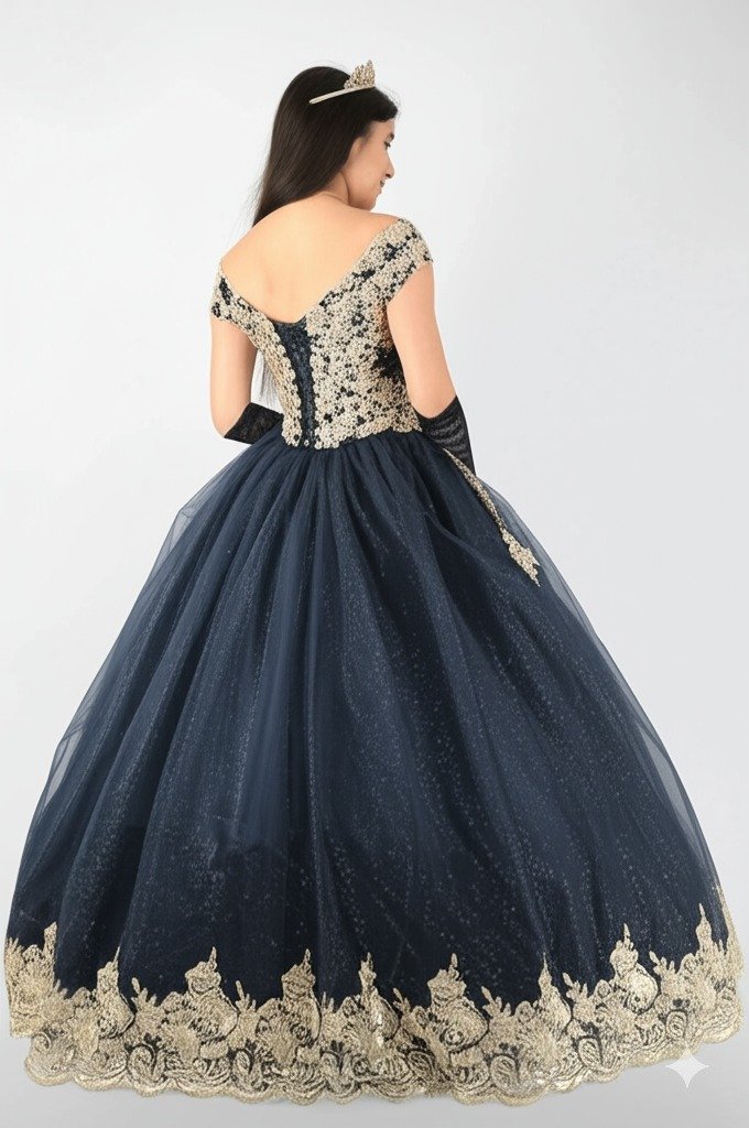 Vestido de 15 Años “Noche Estrellada” ✨🌙: conviértete en la protagonista de tu gran noche con este diseño de corte princesa en intenso azul noche salpicado de toques dorados que rememoran un firmamento estrellado. Con una falda de varias capas de tul brillante y un escote off-shoulder adornado con bordados y sutiles transparencias, cada movimiento reflejará elegancia y sofisticación. El corset, enriquecido con apliques dorados y pedrería, se adapta perfectamente a tu figura gracias a su sistema ajustable en la espalda, mientras que la estructura ligera del tul te garantiza comodidad durante toda la celebración. Disponible además en rosa pastel, champagne y durazno, este vestido fusiona realeza y modernidad para hacer de tu fiesta un recuerdo imborrable.
