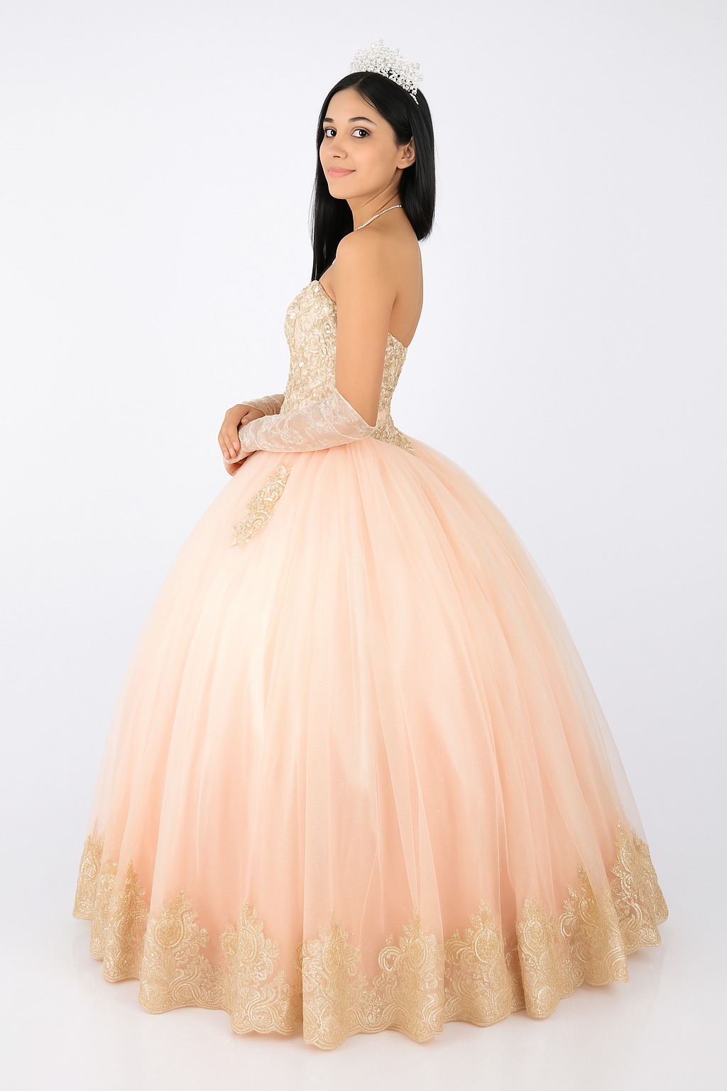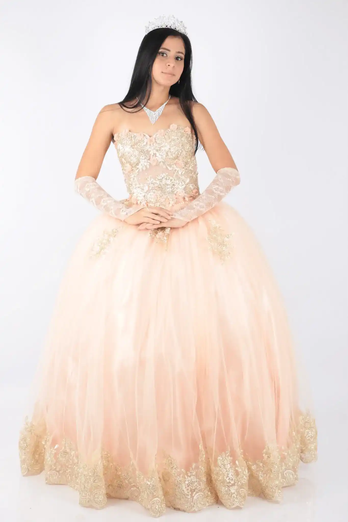 Este vestido estilo princesa, con su falda amplia de tul y encaje bordado, crea una silueta espectacular mientras aporta volumen y movimiento. El escote strapless, acompañado de aplicaciones florales y sutiles transparencias, otorga un toque de romanticismo y frescura, mientras que los bordados dorados en la falda y corset aportan un brillo encantador, elevando aún más la belleza de la prenda.